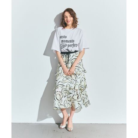 【Japan Fabric】コーディネートの主役にぴったりなロングスカート。ほどよい張り感とシアー感のきれいな細番手の糸のサテン地を使用。ジャパンファブリックならではの上質な素材が着心地よく、より一層高級感に溢れます。そこにオリジナルの大胆なボタニカルライン柄をのせて、夏らしい爽やかなデザインに仕上げました。動くと優しく揺らぐ、上品なレイヤードディテールもポイント。ウエストは締め色でまとめドロスト仕様にすることで、ストレスのない楽な着心地に。トップスインもおしゃれに決まりつつ程よくカジュアルなムードがプラスされた、デイリーに気兼ねなく穿いていただける大人の女性の為のスカート。お揃いでお作りしたトップスを合わせたワンピース風の着こなしもおすすめです。