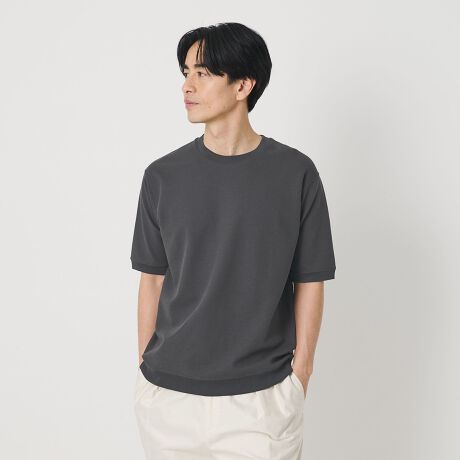 ただし、リブの締め付けは強すぎず、すっきりとした印象で、Tシャツ感覚で着用いただけます。
