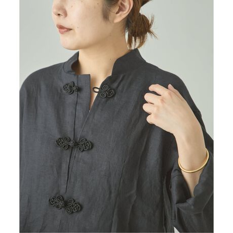 チャイナボタンを留めてシャツとしても、前開きで羽織にしてもおすすめ。