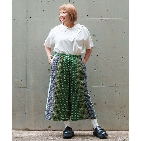 3種類の幾何学柄をミックスして仕立てた、存在感のあるワイドパンツ。