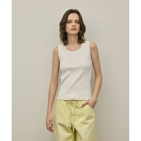 合繊素材でお作りしたノースリーブ型のリブニットトップス。衿ぐりとアームホールの形状にこだわり、1枚着としても品よく見えるように仕上げました。癖のないベーシックなデザインで、どんな装いにもスマートに馴染みます。ジャケットのインナーやキャミワンピースのインナーに、またお揃いでお作りしたカーディガンを羽織ったアンサンブルスタイルなど、様々なアイテムとの着回しに重宝してくれる一品です。