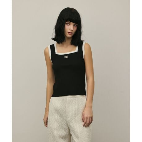 モダンなバイカラーディテールと、胸元に添えた華やかなビジューロゴがポイントのノースリニットトップス。レーヨンブレンドのしなやかな風合いが素肌でも心地良く、1枚着としても重宝します。バイカラーでトリミングして全体を引き締め、大人っぽく着て頂けるデザインに仕上げました。