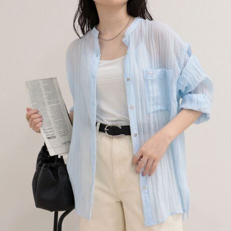 ・リネン混の楊柳素材を使用した軽やかな着心地のバンドカラーシャツ
