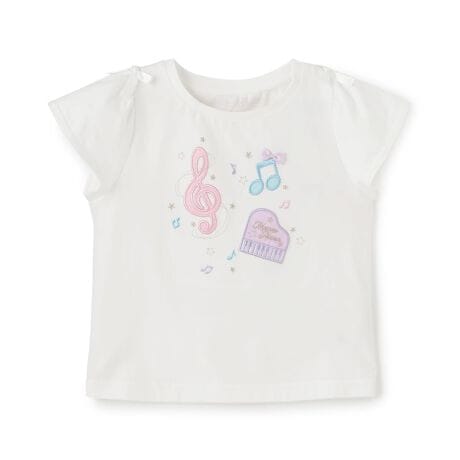 音符のオーガンジーアップリケとラメ刺しゅうがきらめくTシャツです。フレアーな袖と肩のリボンがさりげないアクセント。接触冷感仕様の生地を使用し、ひんやりと快適な着心地に仕上げました。1枚でコーディネートが映える、スカートにもデニムにも合わせやすいアイテムです。内側にお名前を記入できるタグつき。