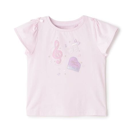 音符のオーガンジーアップリケとラメ刺しゅうがきらめくTシャツです。フレアーな袖と肩のリボンがさりげないアクセント。接触冷感仕様の生地を使用し、ひんやりと快適な着心地に仕上げました。1枚でコーディネートが映える、スカートにもデニムにも合わせやすいアイテムです。内側にお名前を記入できるタグつき。