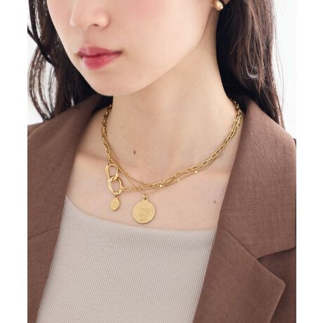 異なるチェーンを組み合わせた重ね付け風デザインが、首元に華やかさと奥行きをプラスしてくれるネックレスです。コインモチーフとリングパーツがアクセントとなり、シンプルなコーディネートも一気におしゃれな印象に仕上げてくれます。一本でレイヤードスタイルが完成するため、コーデに悩まず取り入れやすいのも魅力です。軽やかなつけ心地でデイリー使いしやすく、カジュアルからきれいめまで幅広いスタイルにマッチします。顔まわりを明るく見せ、さりげなく存在感を演出できるアイテムです。季節を問わず活躍し、コーディネートのアクセントとして重宝します。