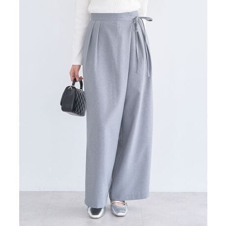 ウエストのリボンデザインがアクセントとなり、さりげなく女性らしさを引き立ててくれる一枚です。ラップ仕様ならではの立体感が生まれ、動きのあるきれいなシルエットを演出します。ゆったりとしたワイドなラインで脚のラインを拾いにくく、リラックスしたはき心地を叶えながらも上品な印象に仕上がります。オンにもオフにも使いやすく、ブラウスを合わせればきれいめに、カットソーと合わせれば程よくカジュアルなスタイルが完成します。着回し力が高く、幅広いシーンで活躍してくれるアイテムです。