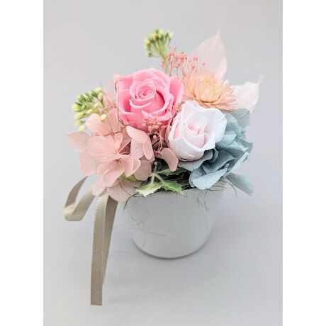 やさしい色合いのローズとアジサイを合わせた上品でかわいらしいプリザーブドフラワーアレンジメント。