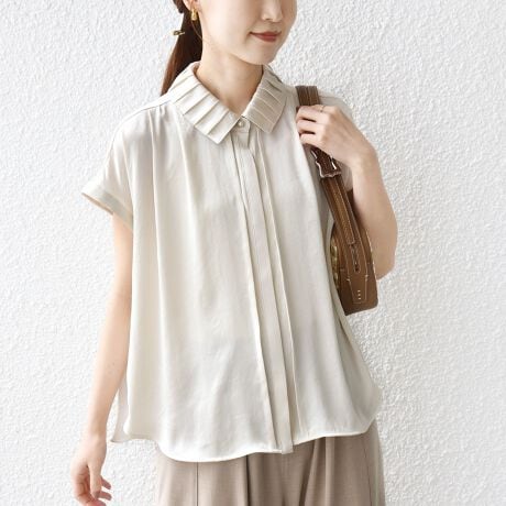 繊細なタックプリーツを施した襟が特徴的なデザインブラウス。