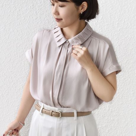 繊細なタックプリーツを施した襟が特徴的なデザインブラウス。
