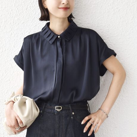 襟のデザインとパールモチーフがポイントになったアクセサリーいらずのブラウス
