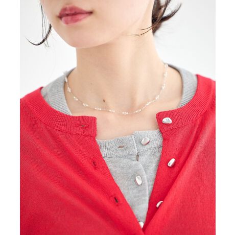 小さなビーズをミックスしたデザインが、首元にやさしい華やかさを添えてくれるネックレスです。カラーバランスが絶妙で、シンプルなコーディネートにも自然と馴染みながらアクセントとして活躍します。華奢なサイズ感で主張しすぎず、日常使いしやすいのも魅力です。軽やかな着け心地で長時間でも快適にお使いいただけます。単品でさらりと着けるのはもちろん、他のネックレスとの重ね付けも楽しめるため、スタイリングの幅が広がります。毎日の装いにさりげない可愛らしさをプラスしてくれるアイテムです。