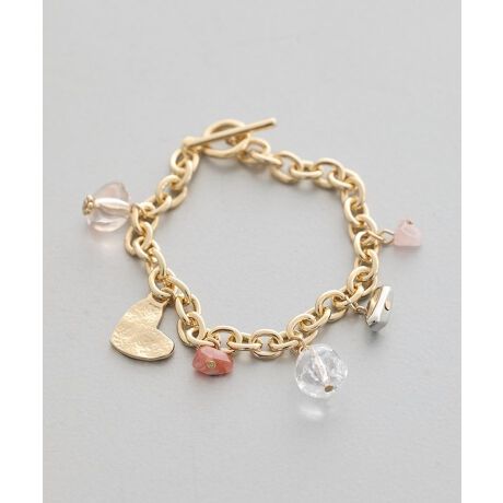 ナチュラルな風合いのストーンとメタルチャームをミックスした、表情豊かなブレスレットです。一つひとつ異なる雰囲気のパーツが絶妙に調和し、手元にこなれ感を演出してくれます。シンプルなトップスに合わせるだけで、洗練された印象に仕上がるのが嬉しいポイントです。着脱しやすい仕様で日常使いにも取り入れやすく、季節を問わず活躍します。気軽にトレンド感を取り入れたい方にもおすすめです。