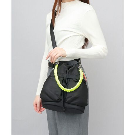 ネオンカラーのコードハンドルとショルダーベルトで、スタイリングに合わせて、斜め掛け・肩掛け・手持ちのできる仕様。不要時には取り外しができるので、片方を取り付けてすっきりと持てるのも嬉しいポイント。
