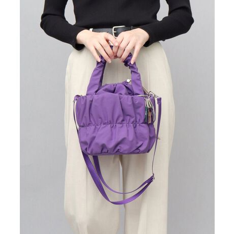 本体と同素材を使用した、ふっくら柔らかなギャザーハンドルが特徴。光沢感のあるテープ素材を使用したショルダーベルトは、不要時には取り外しが可能で、スタイリングに合わせて斜め掛け・肩掛け・手持ちに対応します。