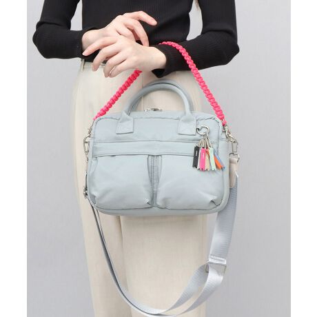 芯地の入ったしっかりとしたハンドルに加え、ネオンカラーのコードハンドルとショルダーベルトで、手持ち・肩掛け・斜め掛けのできる3WAY仕様。コードハンドルとショルダーベルトは、取り外しが可能。