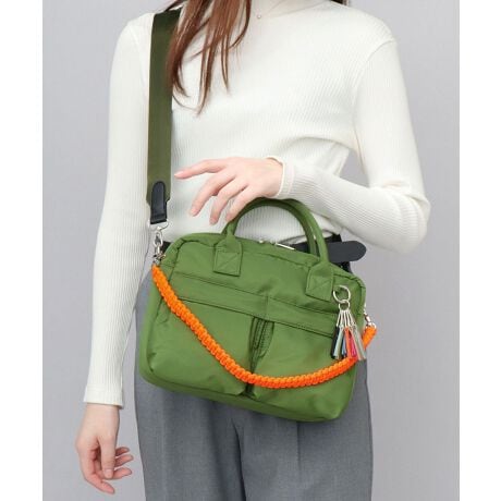 芯地の入ったしっかりとしたハンドルに加え、ネオンカラーのコードハンドルとショルダーベルトで、手持ち・肩掛け・斜め掛けのできる3WAY仕様。コードハンドルとショルダーベルトは、取り外しが可能。
