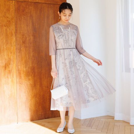 たっぷりのチュールを繊細な花柄の刺繍素材にレイヤードした上品なドレス。