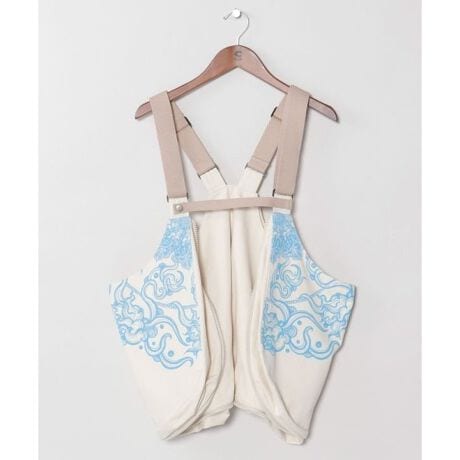 【Amina×VORRUK】タイのアーティストVORRUKとのコラボベストBAG。[HEAVEN OF THE EARTH]天から大地を覗くような構図で、雲と蓮が空と地をつなぎ、日常に潜む自然の美しさや神秘を表現。日々移ろいゆく日常の中で見つけたもの、大地に咲く花、流れていく雲など、身近な自然へのリスペクトを込めた世界観を表現。大容量収納に加え、ポケット付きのベストへと変形する2WAY仕様。旅や野外イベントでも手ぶらで軽快に過ごせる実用性を備えた一着。アートと機能が融合したユニークなアイテム。