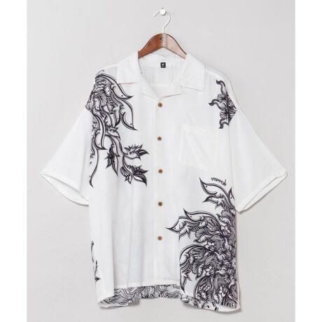 [型番:IAC-6207-2026]【Amina×VORRUK】タイのアーティストVORRUKとのコラボ。サンユウカの花と風車をモチーフにしたプリントが印象的な開襟メンズシャツ。単色の柄が落ち着いた存在感を放ち、ゆったりとしたシルエットが心地よい抜け感を生みます。柔らかなレーヨン素材で、さらりとした着心地が魅力のアイテムです。