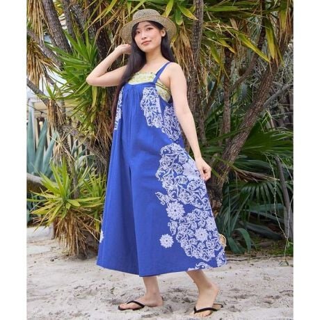 [型番:IAC-6202-2026]【Amina×VORRUK】タイのアーティストVORRUKとのコラボ。朝日に咲く花と太陽をテーマにした曼荼羅のようなデザインが印象的なサロペット。左右に大胆な柄配置とボリュームのある綿素材が、存在感のあるスタイルを生み出します。大きなポケットと長さ調整できる肩紐で、機能性と着心地にもこだわったアイテムです。
