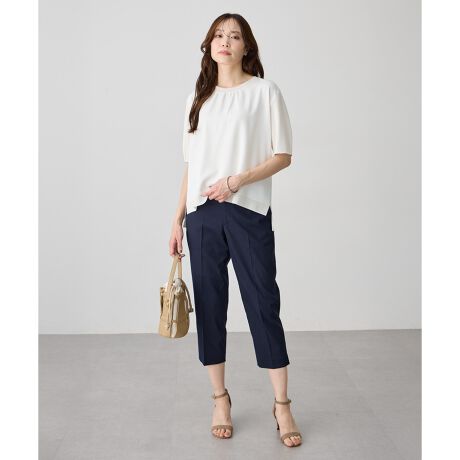 [型番:352693]一枚で整うコンビニット前身頃に布帛素材を使用した、きちんと感のあるニットプルオーバー。異素材の組み合わせでシンプルながらも表情があり、上品な印象に仕上がる一枚です。一枚でさらっと着ても様になり、ジャケットのインナーとしてもすっきり収まります。きれいめなボトムと合わせると、より整ったスタイリングに仕上がります。