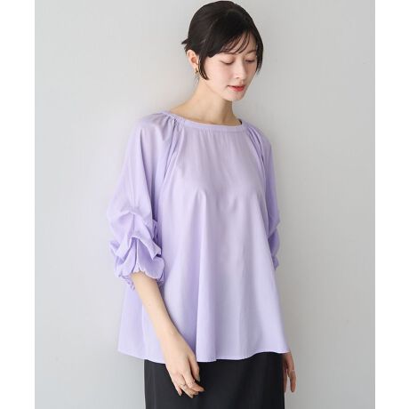 袖のギャザーが生み出すふんわりとしたシルエットが、気になる二の腕をさりげなくカバーします。