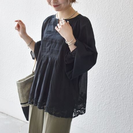 透け感とフロントのタックやレースの華やかさが目を惹くブラウス。