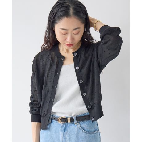 ほんのり透けるシアー素材に、ドット柄の編み地が映えるニットカーディガン。