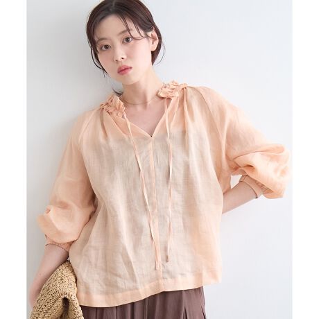 顔まわりをすっきり見せるVネックにネック周りのフリルが華やかなアクセントに。