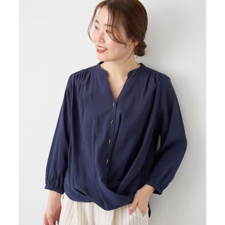 フロントのバーボタンががさりげないアクセントになった、カシュクールデザインのブラウス。