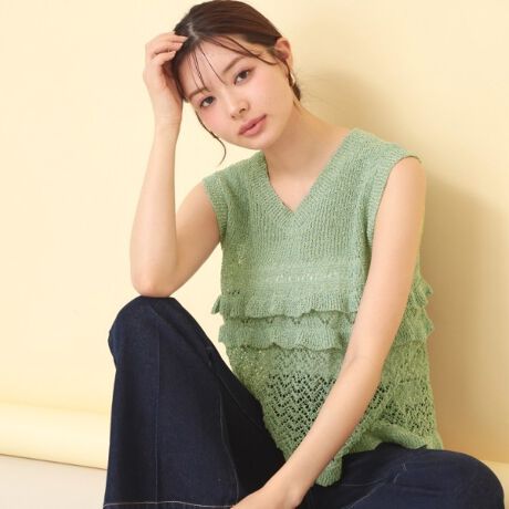 トレンドの透かし編みとペプラムデザインが着映えするノースリーブニット