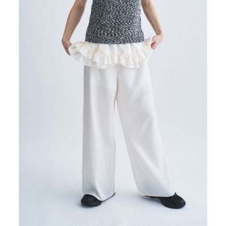贅沢に重ねられた二重フリルが、歩くたびに軽やかなリズムを刻むワイドパンツ。