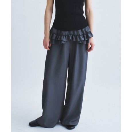 贅沢に重ねられた二重フリルが、歩くたびに軽やかなリズムを刻むワイドパンツ。