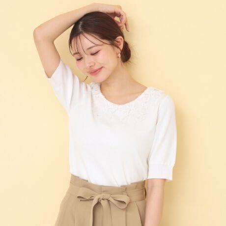 顔周りを華やかに彩るレース襟が主役のフェミニンなデザインニット