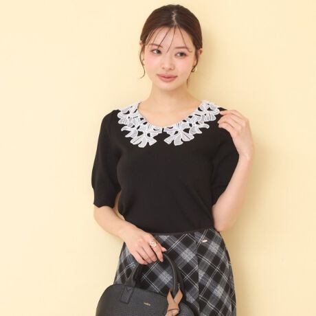 顔周りを華やかに彩るレース襟が主役のフェミニンなデザインニット