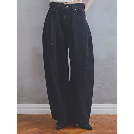 メンズライクな余裕を感じさせる、ルーズなカーブシルエットのデニムパンツ。最大の特徴はサイドパネルに贅沢にはめ込まれた繊細なレース。ボリュームのある力強いシルエットと透け感のあるレースのコントラストが、装いに奥行きを与えてくれます。パネルの切り替え部分にはさりげなくピコレースを忍ばせ、細部までこだわりを詰め込みました。ウエストにはサイズ調整が可能なベルトが付いており、お好みのフィット感で着用できるのも嬉しいポイント。