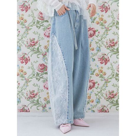 メンズライクな余裕を感じさせる、ルーズなカーブシルエットのデニムパンツ。最大の特徴はサイドパネルに贅沢にはめ込まれた繊細なレース。ボリュームのある力強いシルエットと透け感のあるレースのコントラストが、装いに奥行きを与えてくれます。パネルの切り替え部分にはさりげなくピコレースを忍ばせ、細部までこだわりを詰め込みました。ウエストにはサイズ調整が可能なベルトが付いており、お好みのフィット感で着用できるのも嬉しいポイント。