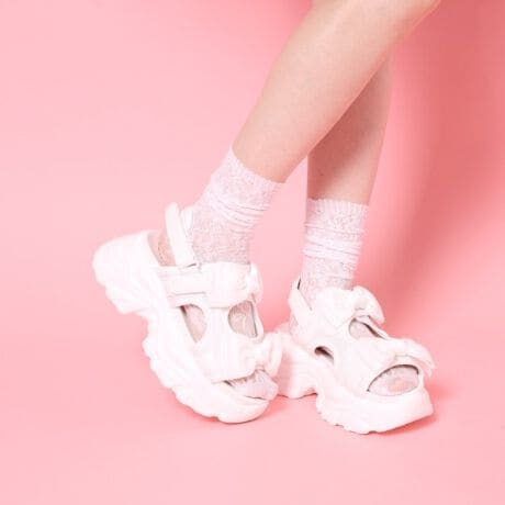 厚底サンダルに大きなリボンが2つついたガーリーサンダル