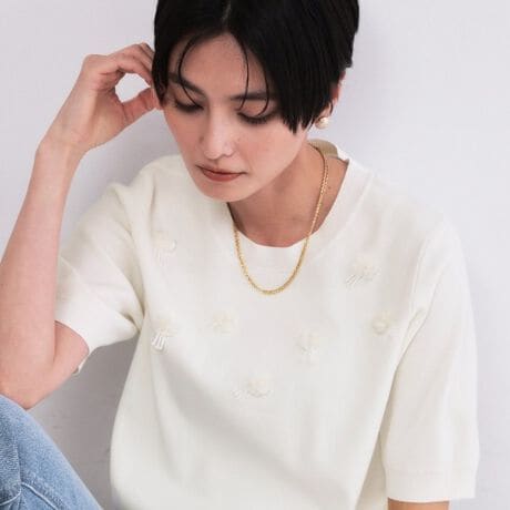 フラワーモチーフのビジューをあしらったデザインニットトップス