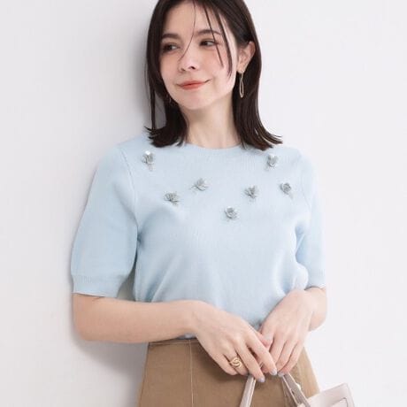 フラワーモチーフのビジューをあしらったデザインニットトップス