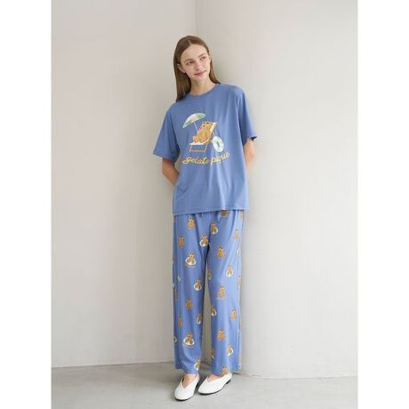サングラス焼けしたお顔に思わず胸きゅん。夏をめいっぱい楽しむベアをテーマにした、ファミリーやカップルでお楽しみいただけるSUMMER BEARシリーズです。浮き輪でひと休みしたり、アイスを食べたり、プールサイドでのんびり過ごすベアを総柄プリントした、ストレートシルエットのロングパンツ。サングラスや浮き輪、ロゴのカラフルな配色で、おうち時間にHAPPYな気分を添えます。接触冷感の素材を使用しているので、汗ばむ時期のお風呂上がりやおやすみの時間にも心地よい着用感。右後ろにポケットがひとつ付いています。色はアイボリーとピンク、ネイビーの3色展開。同シリーズのTシャツや雑貨と合わせたり、HOMME、JUNIOR、KIDS、BABYとのリンク・コーディネートもお楽しみください。