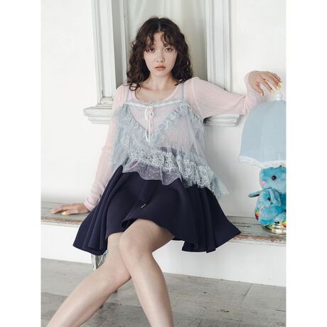 3種類のレースを贅沢に重ね、ランジェリーのような繊細さと甘さを纏ったアウターキャミソール。左側にかけて短くなるランダムヘムが軽やかな動きを生み、ボリューム感のあるシルエットにやわらかな抜け感を添えます。胸元と裾にはレースフリルをふんだんにあしらい、ふんわりと広がるロマンティックな印象に仕上げました。梯子レースとベロアリボン、ミニフリルが胸元を可憐に彩り、装いに華やぎを添える一枚です。リボンで身幅の調整が可能で、レイヤード次第で異なる表情を楽しめるのも魅力です。