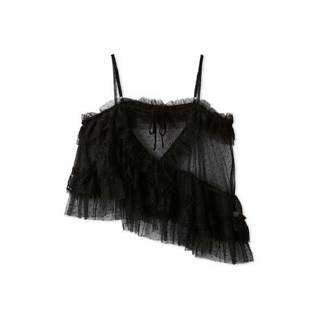 3種類のレースを贅沢に重ね、ランジェリーのような繊細さと甘さを纏ったアウターキャミソール。左側にかけて短くなるランダムヘムが軽やかな動きを生み、ボリューム感のあるシルエットにやわらかな抜け感を添えます。胸元と裾にはレースフリルをふんだんにあしらい、ふんわりと広がるロマンティックな印象に仕上げました。梯子レースとベロアリボン、ミニフリルが胸元を可憐に彩り、装いに華やぎを添える一枚です。リボンで身幅の調整が可能で、レイヤード次第で異なる表情を楽しめるのも魅力です。