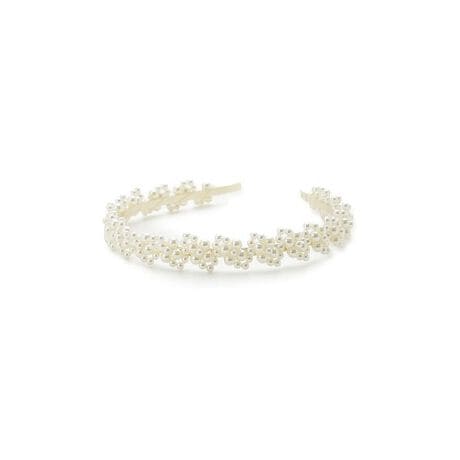 リズミカルに並んだパールの粒が目を惹くカチューシャ。 お花のモチーフに組まれたビーズの周りを、小粒のビーズが伝う独創的なデザイン。立体感のあるビーズの連なりが、お顔周りに優雅な曲線と華やかな艶めきを添えてくれます。土台には細めのラインを採用し、華奢で上品な印象に仕上げました。