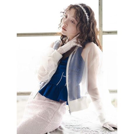 ワッシャー加工を施しシボ感、ハリ感と透け感のあるファンシーな素材感のオーガンジーで作成いたしました。MA-1ブルゾン風の切り替えディティールとほどよいサイズ感のシルエットが特徴。軽くてシワが気になりにくく、カーディガン感覚で着用できるライトなデザインなので、夏の冷房対策に持ち運ぶのもおすすめのアイテムです。左下にさりげなく施されたロゴ刺繍もポイント。