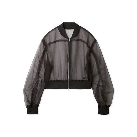 ワッシャー加工を施しシボ感、ハリ感と透け感のあるファンシーな素材感のオーガンジーで作成いたしました。MA-1ブルゾン風の切り替えディティールとほどよいサイズ感のシルエットが特徴。軽くてシワが気になりにくく、カーディガン感覚で着用できるライトなデザインなので、夏の冷房対策に持ち運ぶのもおすすめのアイテムです。左下にさりげなく施されたロゴ刺繍もポイント。