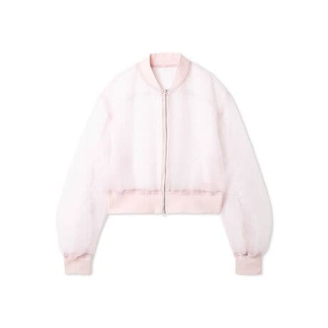 ワッシャー加工を施しシボ感、ハリ感と透け感のあるファンシーな素材感のオーガンジーで作成いたしました。MA-1ブルゾン風の切り替えディティールとほどよいサイズ感のシルエットが特徴。軽くてシワが気になりにくく、カーディガン感覚で着用できるライトなデザインなので、夏の冷房対策に持ち運ぶのもおすすめのアイテムです。左下にさりげなく施されたロゴ刺繍もポイント。