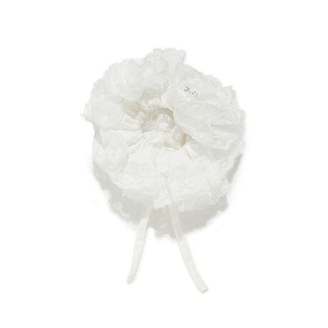 ナチュラルな透け感が魅力のコットンボイルと、繊細な花柄模様のラッセルレースを組み合わせたシュシュ。質感の異なる2素材を接ぎ合わせ、緻密なギャザーを施すことで、まるでチュチュのような立体的で存在感のあるボリュームシルエットに。ふんわりとした立体感が、シンプルなまとめ髪やポニーテールに華やかな彩りをプラス。内側には細身のリボンを忍ばせており、結んだ際にさりげなく揺れるニュアンスを楽しめるのもポイント。