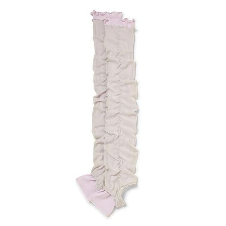 質感の異なるシアー素材を組み合わせた、遊び心溢れるトレンカセット。パワーネット素材は、サイドの細かなギャザーと土踏まずを細く見せる設計で、繊細かつモードな印象に。シアーリブ素材はカットワークやピコゴムをあしらい、可憐な表情に仕上げました。 それぞれ配色で重ねることで、色と素材が混ざり合い、ニュアンスの変化を楽しめるのが最大のこだわり。ロング丈なので、クシュクシュと溜めてルーズに履くのはもちろん、ニーハイ丈まで伸ばしてスタイリングの主役にするのもおすすめ。